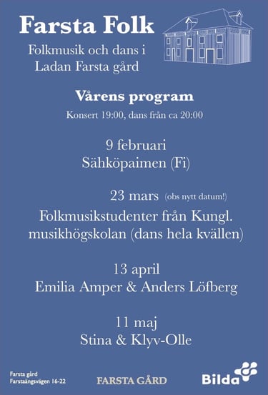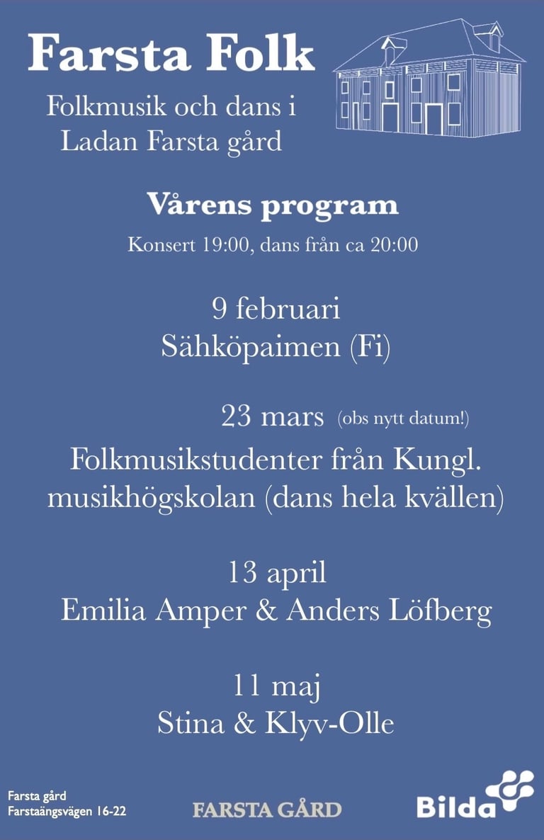 Vårens program av konserter och danskvällar på Farsta gård